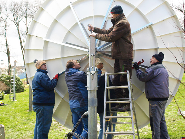 Montage des Prodelin 3,80 m Spiegel mit Motorantrieb von 75°E bis 34°W in Auerbach.