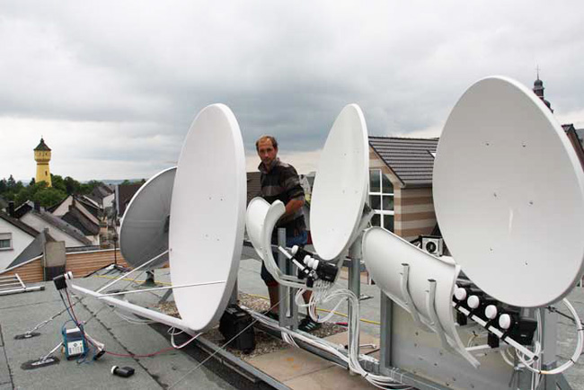 Satanlage Kirchberg mit 2 Sück. WaveFrontier T90, LAMINAS OFC-1200 und LAMINAS AS-1800, 16 Satelliten für 8 Teilnehmer.
