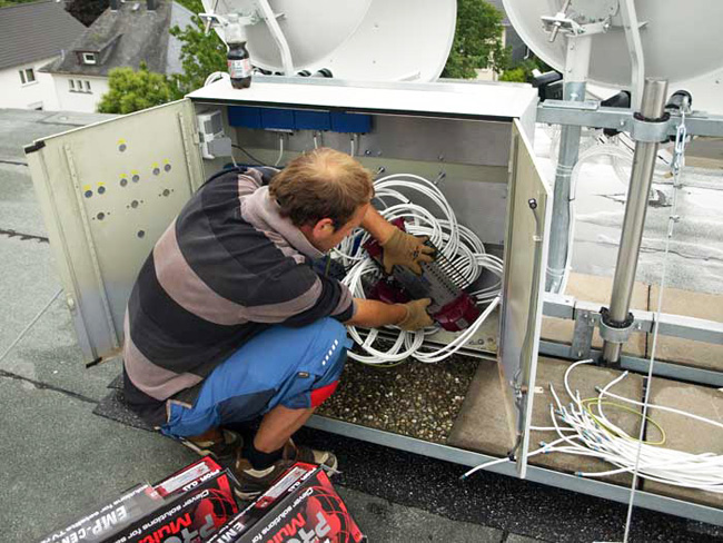 Schaltschrank mit 4 Stück DiSEqC 1.1 Schalter Spaun SUR 420 und 4 Stück Multischalter 17/8 von EMP Centaurio.